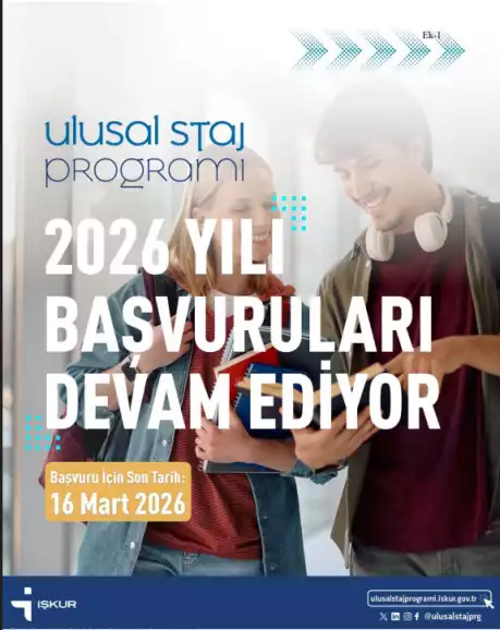 Türkiye İş Kurumu (İŞKUR) tarafından yürütülen Ulusal Staj Programı kapsamında 2026 yılı başvuruları devam etmektedir. Program için son başvuru tarihi 16 Mart 2026'dır.